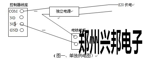 2、 鎖到控製器的連接線需采用2芯電源線,控製器到(dào)鎖距離不可以超過100米,線徑大於1.0 mm。如有需門磁檢(jiǎn)測線則需多2芯線。(可根據現場需(xū)要定)。如果輸出12V電源有明顯降壓則可以微調電源電壓(yā)到13.6V或單獨給電鎖供電(如圖一)。