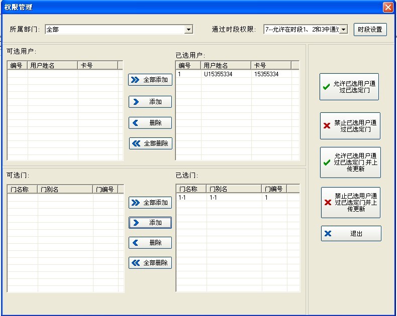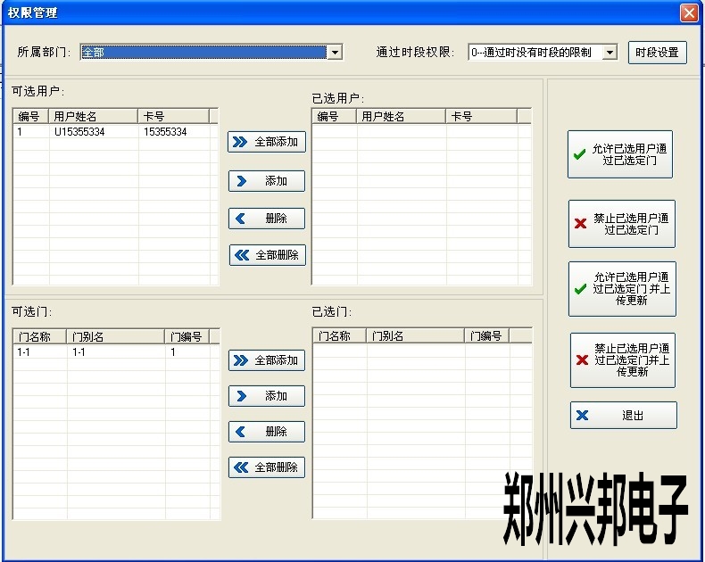 4、上傳完成後關閉窗口,在‘通過時間段權限’中選擇需要的時間段然後將用戶和控(kòng)製器都添加進(jìn)去,最後(hòu)點(diǎn)擊‘允許已選用(yòng)戶(hù)通過已(yǐ)選定門並上傳(chuán)更(gèng)新’上(shàng)傳權限。如下圖所示(shì)