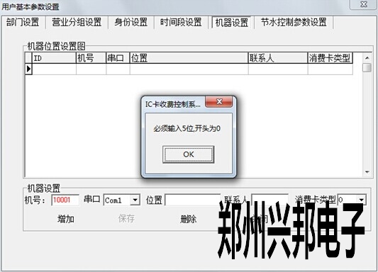 在軟件上添加水控機,售飯機相(xiàng)應的機器號:打開軟件,係統管理---用戶參數設置---用戶基本參數設置(zhì)---機器設置,在機號那添加相應的機(jī)器號,例如10001就是(shì)1號機,串口選擇電腦所用的通訊串口。如下圖所示(shì),圖(tú)中所用的通訊串口為COM1。但在(zài)極其特殊的情況下(xià),會出現錯誤提示,機器號開頭為0。如圖所示。