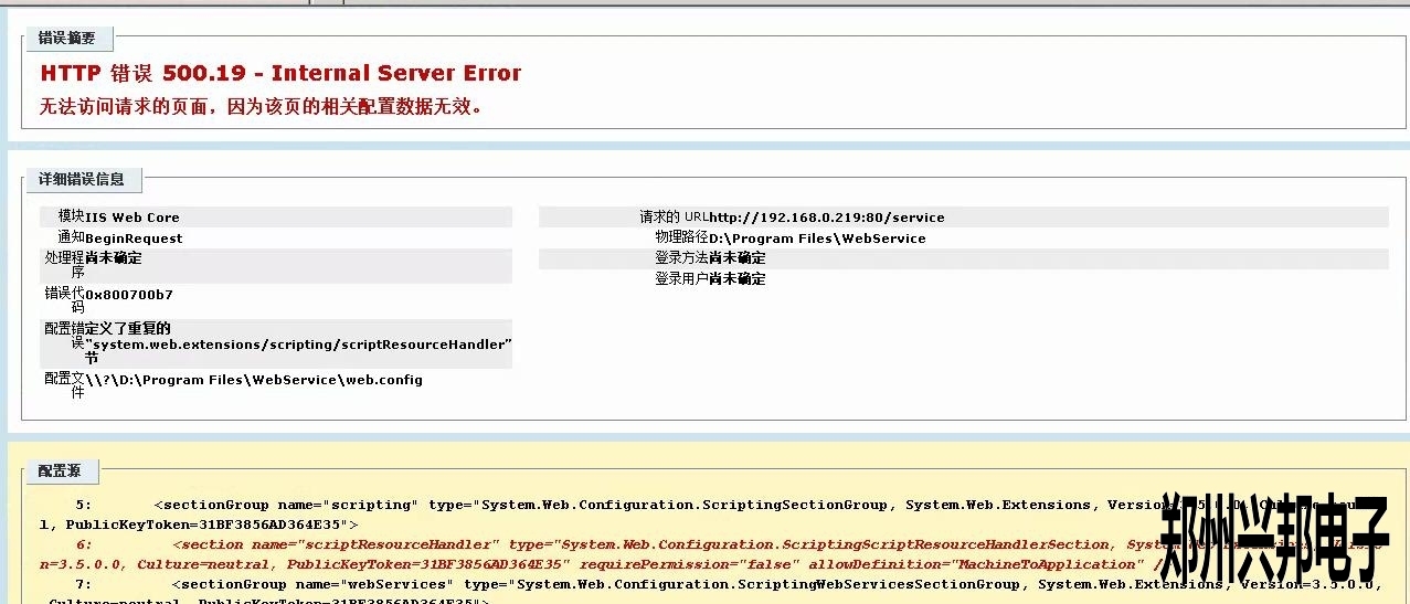 [文章內容(róng)簡介]:客戶使用的互聯網一卡通食堂售飯機,在裝好軟件後配置有(yǒu)誤,瀏覽service時(shí)提示應用程序(xù)中的(de)服(fú)務器錯誤.