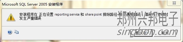 互聯網一卡通食堂售飯機的軟件,采集的信息都通過軟件設置存在數據庫(kù)SQL SERVER2005中,所以安裝軟件,首先要安裝(zhuāng)數據庫SQL SERVER2005,但在安裝數據庫SQL SERVER2005時,安裝程序可能(néng)會在正在設置reporting和shre point 排除路徑(jìng) 期間遇到錯誤,遇到的錯(cuò)誤如圖所示: