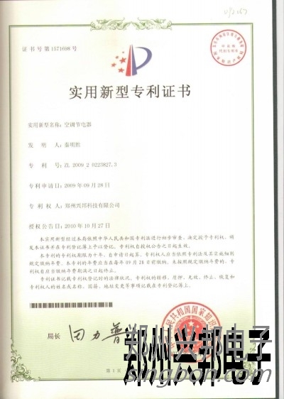 17.C1起草视频電子空調節(jiē)電(diàn)器專利證書